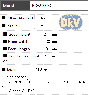 Kích thủy lực Eagle ED-200TC được sản xuất bởi Konno Corporation - Japan. Made in Japan (CO Phòng thương mại Osaka | Japan). DKV VIET NAM CO.,LTD nhập khẩu từ Nhật Bản và phân phối service tại Việt nam.