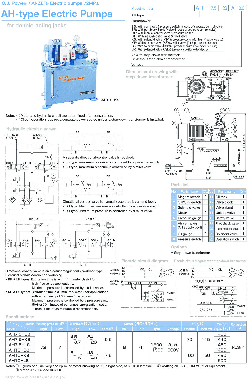Bơm điện thủy lực Osaka AH10-DS sử dụng động cơ: 7.5 kW/380V/50Hz/3ph, với lưu lượng đẩy dầu đạt: 6 lít/phút (tại 720 bar).