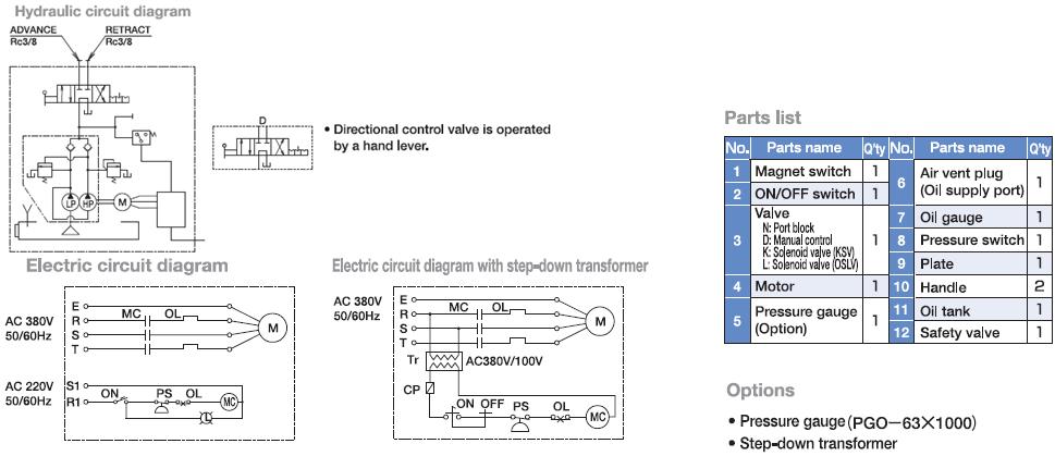 Bơm điện thủy lực Osaka GH1-D thao tác điều khiển valve gạt tay (gạt trái/phải) tương ứng với nâng/hạ (đẩy áp - đẩy dầu/xả áp - hồi dầu) kích thủy lực, tools thủy lực 2 chiều.