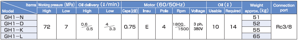 Bơm điện thủy lực Osaka GH1-D sử dụng động cơ: 0.75 kW/380V/50Hz/3ph, với lưu lượng đẩy dầu đạt: 0.5 lít/phút (tại 720 bar), 3.3 lít/phút (tại thấp áp).