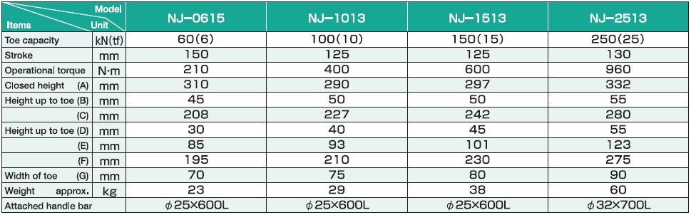Kích móc cơ khí Osaka NJ-0615 có chiều cao nâng nhỏ nhất , khe hở đủ để nhét được càng móc (D = 30 mm), với tiết diện của càng nâng (B x G = 45 x 70 mm). Để vận hành móc tải trọng lớn nhất 6 tấn, lên hết hành trình 150 mm, cần sử dụng một lực đẩy max: 210 N.m, thông qua cánh tay đòn (tay công) dạng cây thép tròn theo kích Trọng lượng: 23 kg.