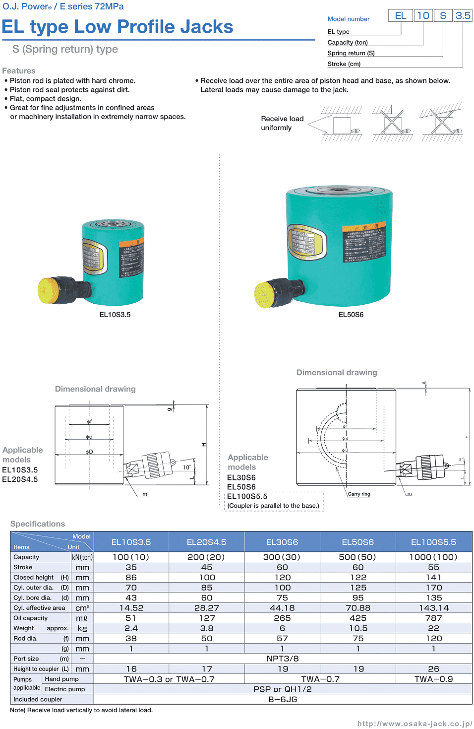 Áp hoạt động kích thủy lực ngắn Osaka EL10S3.5 < 720 bar (72MPa), với coupler tiêu chuẩn ren 3/8"NPT cho phép kích thủy lực ngắn Osaka EL10S3.5 đấu nối nhanh với bơm thủy lực, thông qua ống dây, phụ kiện thủy lực.