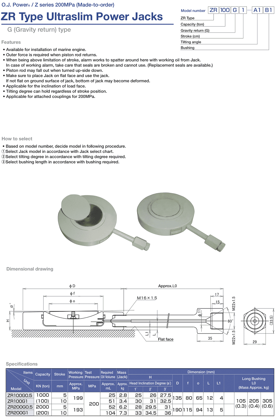 Áp hoạt động kích thủy lực cao áp Osaka ZR100G0.5 thuộc loại cao áp < 2.000 bar (200 MPa), với coupler đặc chủng dạng bắt ren BZ-4J (M22x1.5), cho phép kích thủy lực cao áp Osaka Z100G1 đấu nối nhanh với bơm thủy lực, thông qua ống dây, phụ kiện thủy lực. Dung tích dầu: 25 ml.